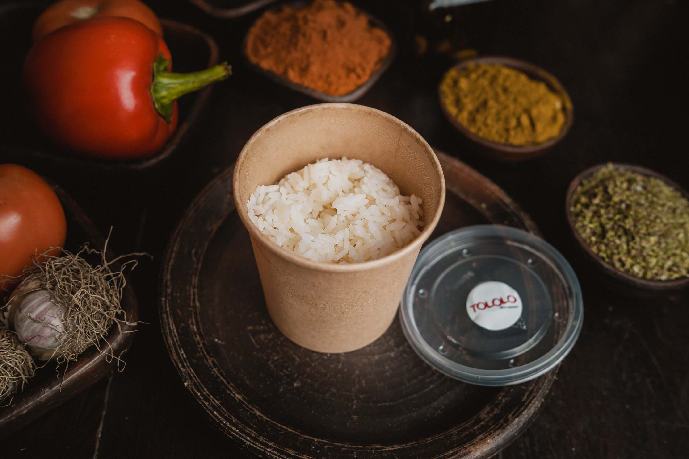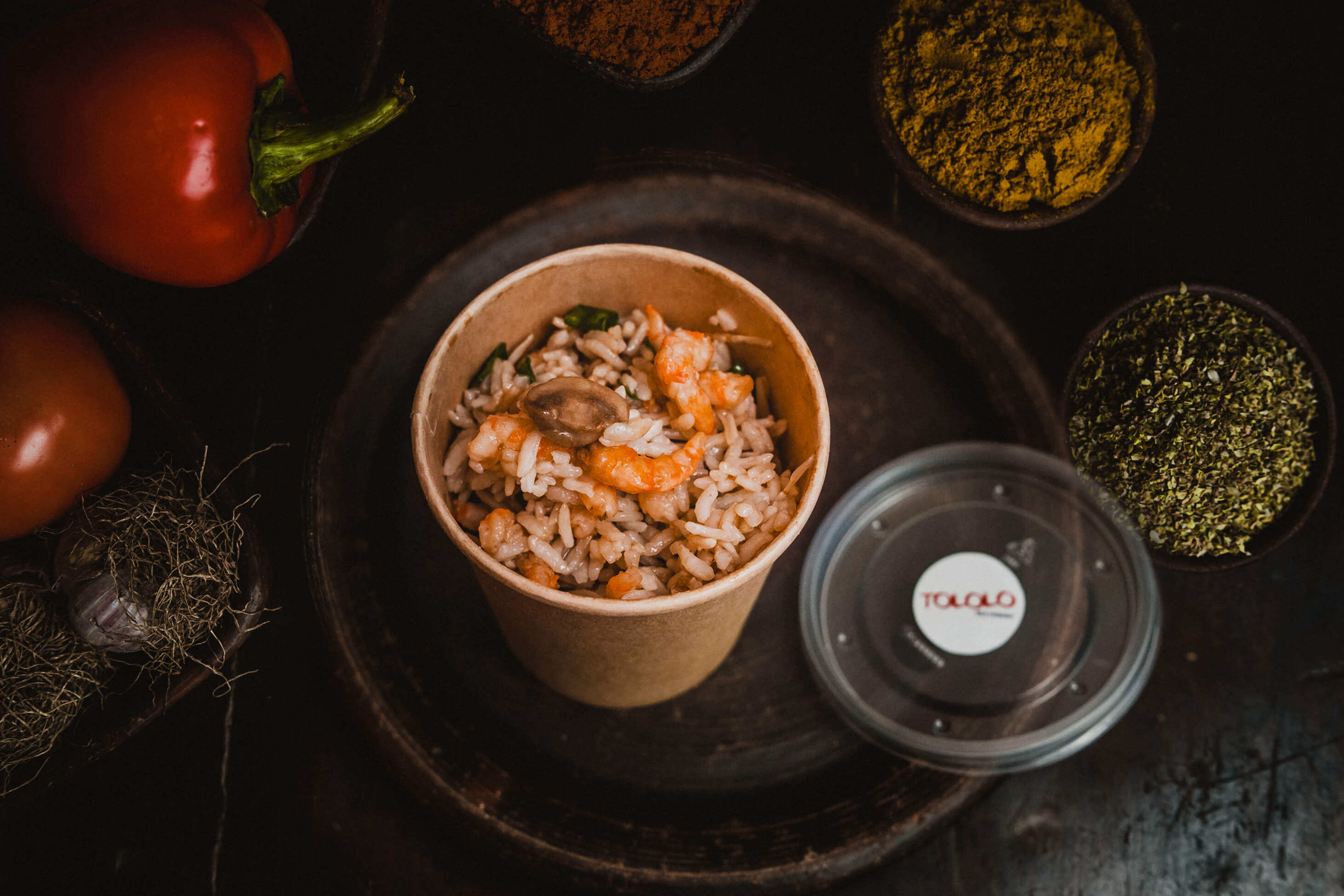 Arroz en su punto, con champignones, camarones y dientes de dragon. Todo con un toque de soya.