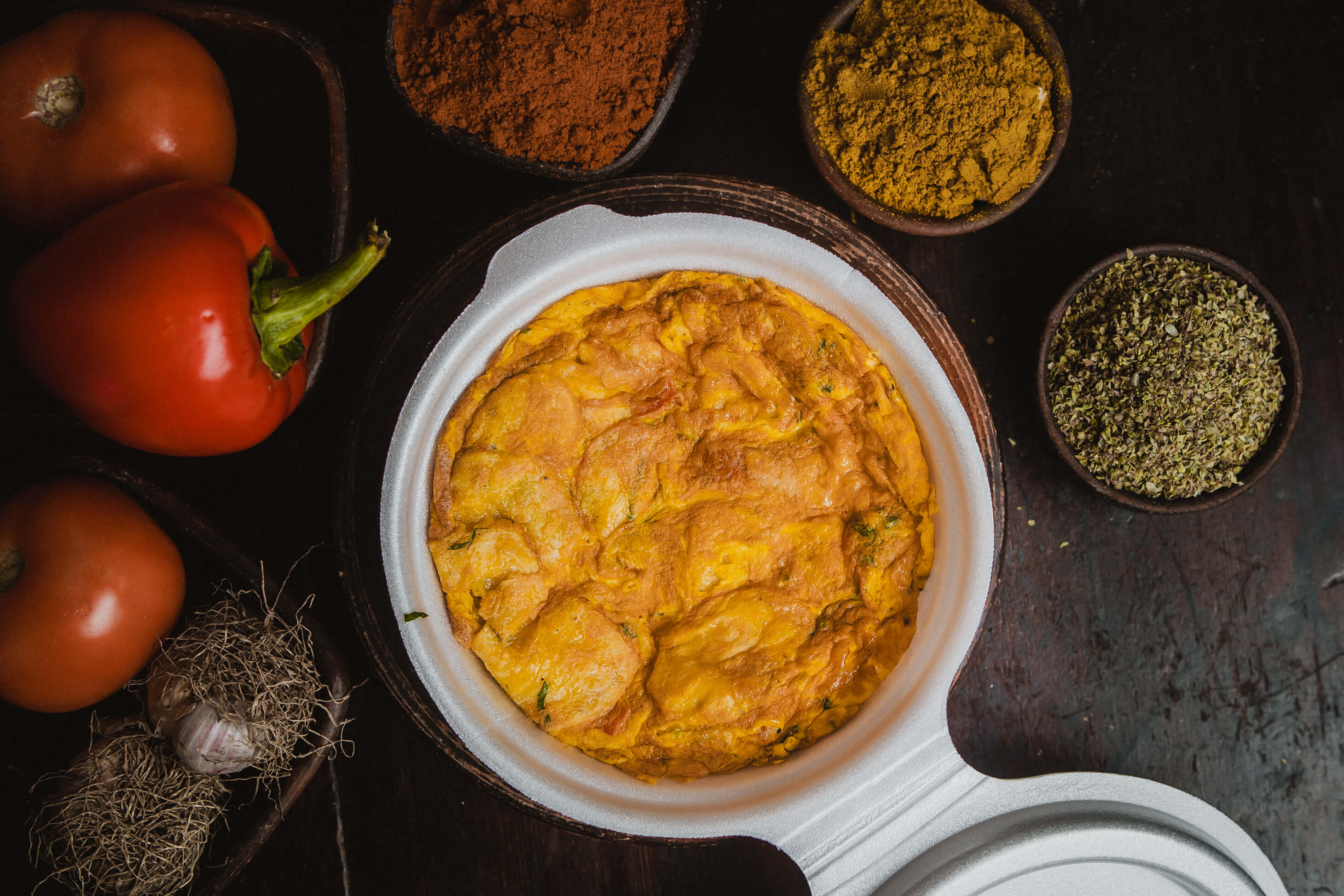 Papas chauchas pre-fritas revueltas con huevo, chorizo español y cilantro