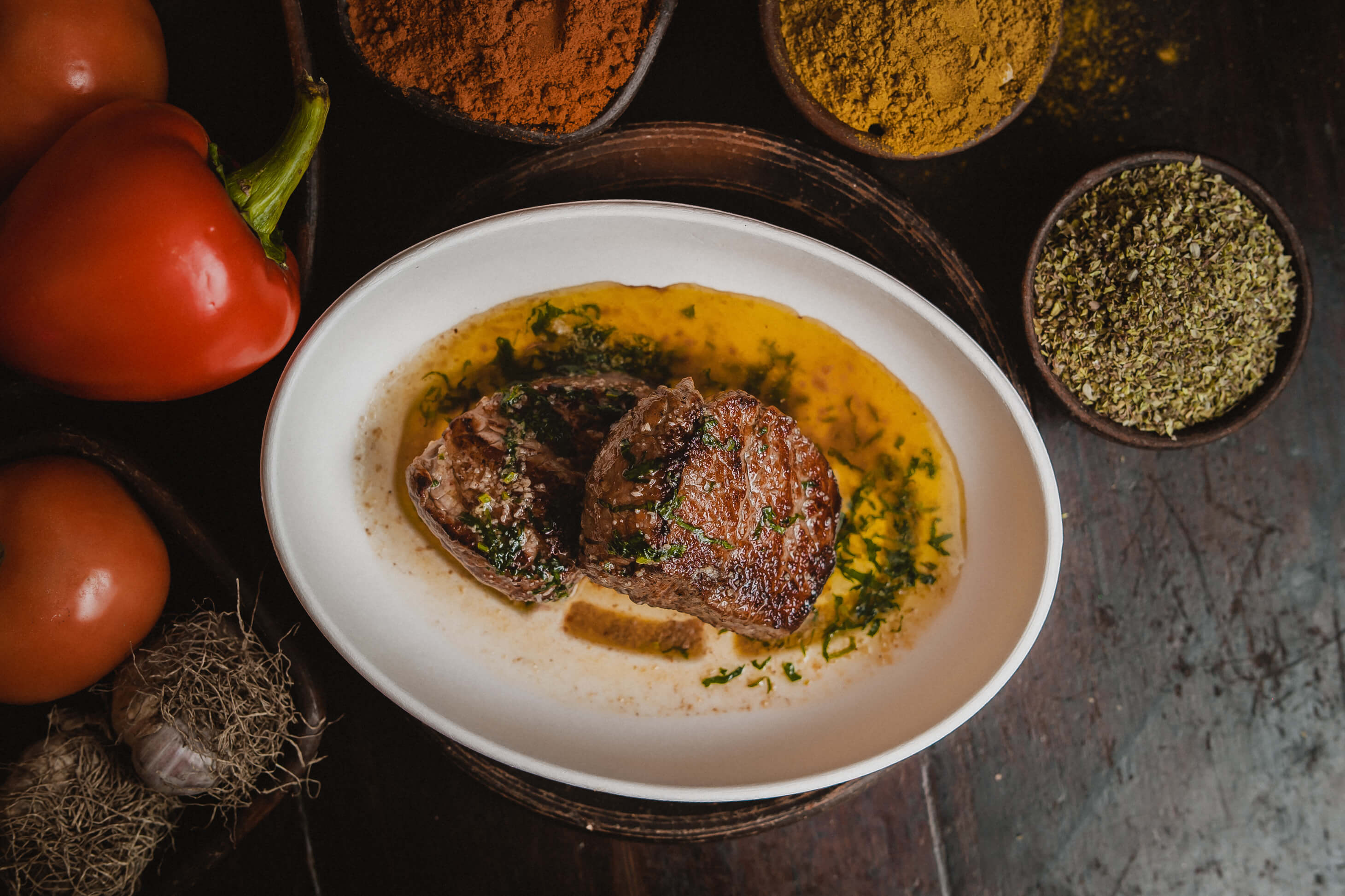 Medallones de filete salteados a fuego fuerte con una reducción de ajo y cilantro fresco