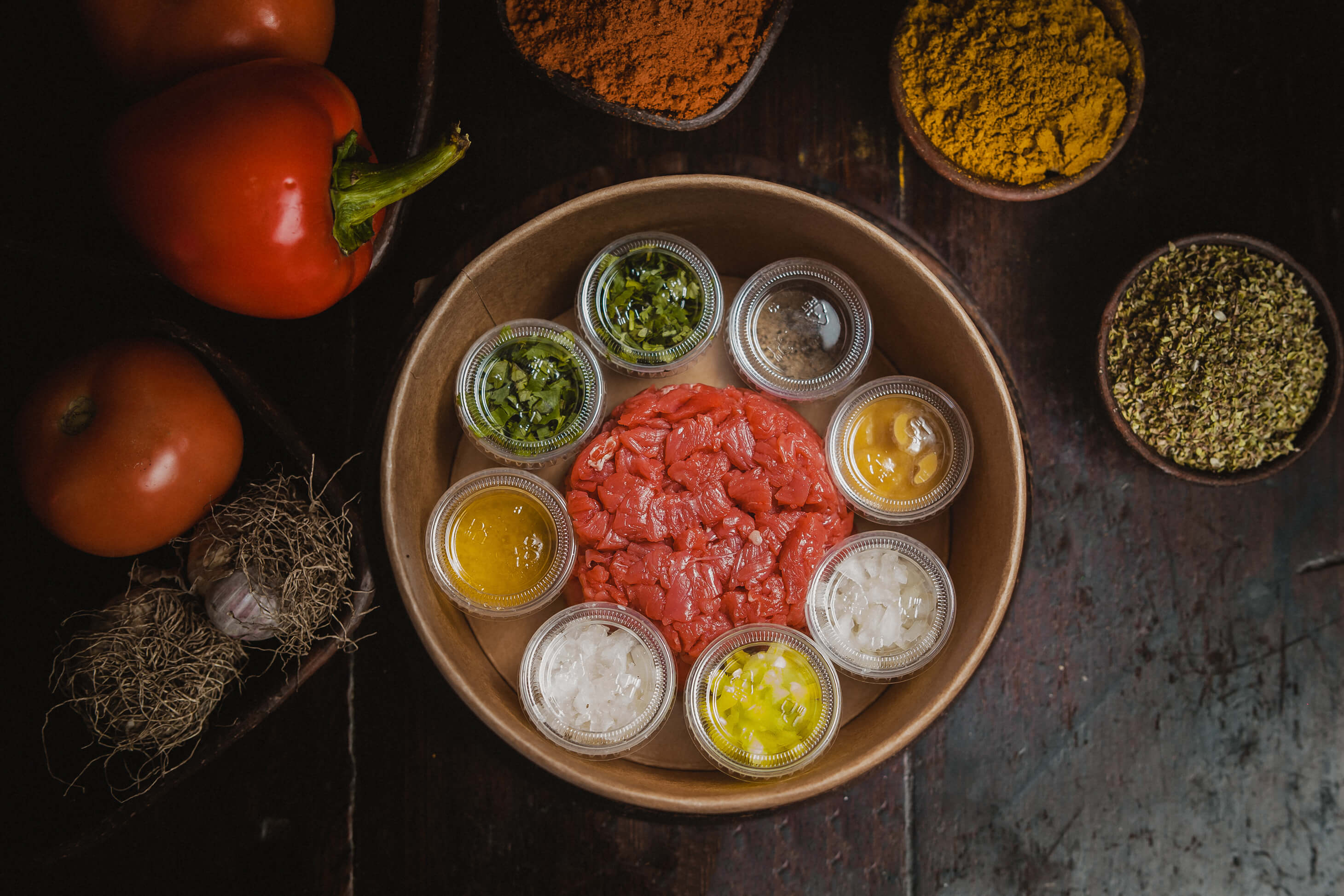 Carne de filete picada 100% magra, sazonada con limón, mostaza, ajo, ají verde, cilantro y pimienta (la sazón tiene que añadirla en casa)