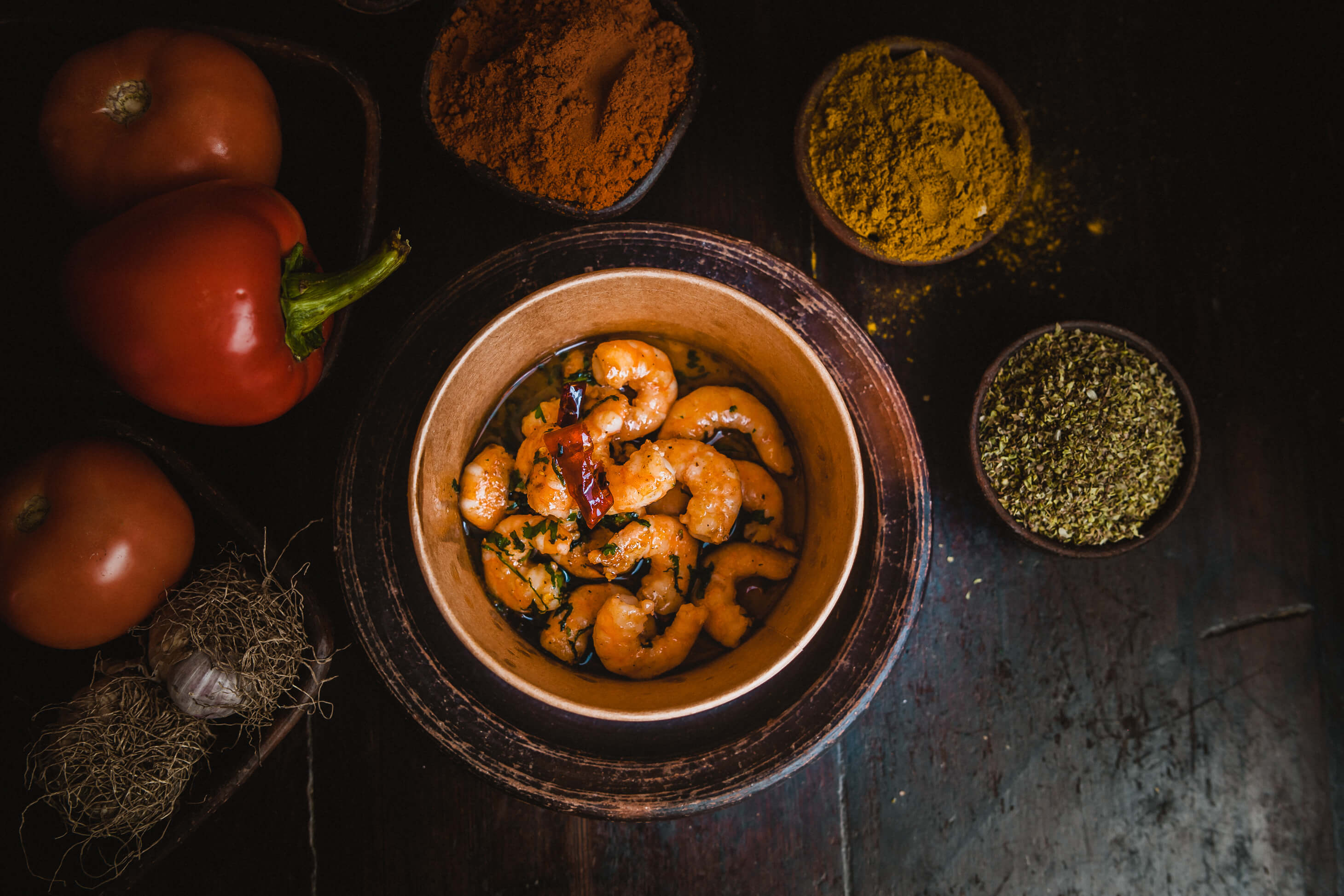 Camarones ecuatorianos salteados al oliva, mantequilla, ají cacho de cabra y ajo